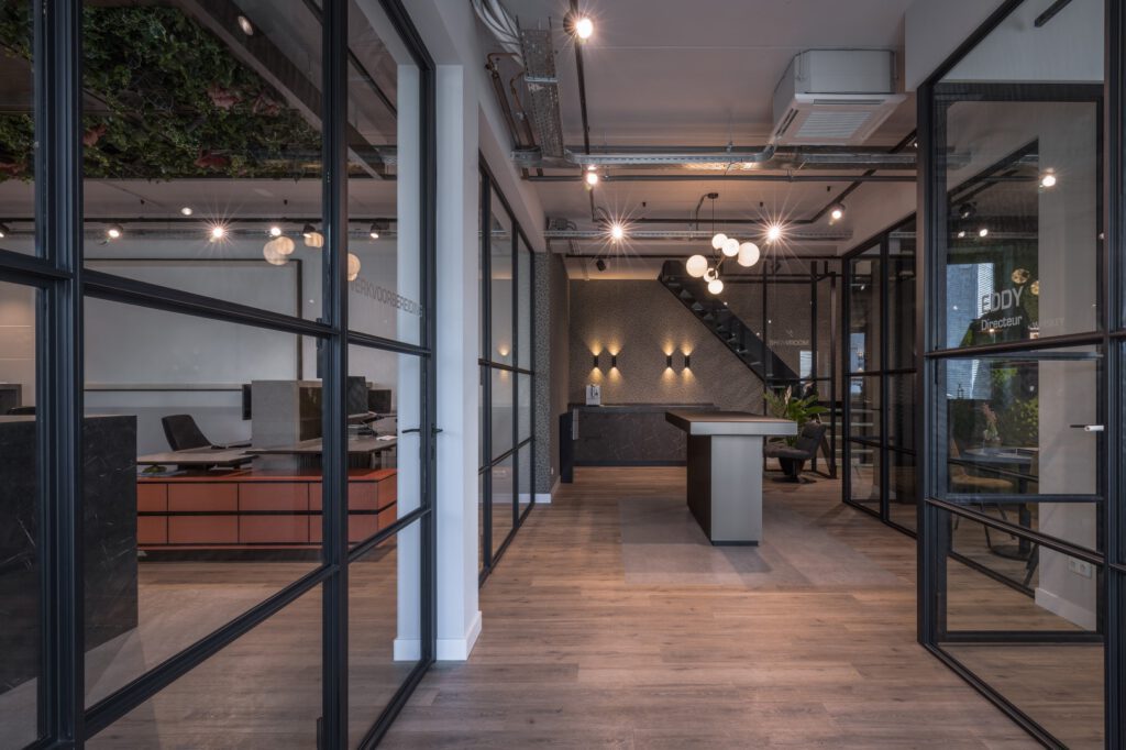 WSB wurde beauftragt, ein schönes Bürodesign mit dem Thema „Work / Meet / Connect“ zu entwerfen. Die angestrebte Atmosphäre ist zugänglich, freundlich, professionell, innovativ. „VISSER Spiegels en Glas“ ist der Handelsname der ehemaligen Spiegelfabriek Visser. 1945 Hr. Daaleman gründete eine Spiegelfabriek in Arnheim. Am 01.04.1966 wurde Hr. JB (Joop) Visser übernahm die Firma. 1996 wurde das Unternehmen von seinem Sohn Eddy Visser übernommen. Im Jahr 2000 zog das Unternehmen an seinen heutigen Standort in Duiven um. Die 3. Generation von Fischern ist jetzt vorhanden.
