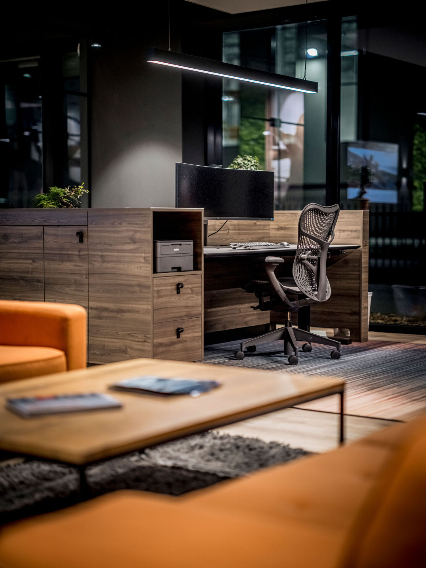 Auch an der Gestaltung des Exterieurs war WSB beteiligt. Beispielsweise wird das Holz auch in der Fassadenverkleidung verwendet, sodass die Verbindung zwischen Außen und Innenraum optimal ist. Die Arbeitsplätze sind alle mit maßgeschneiderten Lösungen zur Aufbewahrung von Produkten und Dokumenten ausgestattet. Durch die Integration von Arbeitsplätzen, Bar und Lounge (Wartebereich für Kunden) entsteht eine entspannte und gastfreundliche Atmosphäre. Das ist Büroarbeit im Jahr 2022 vom Feinsten!