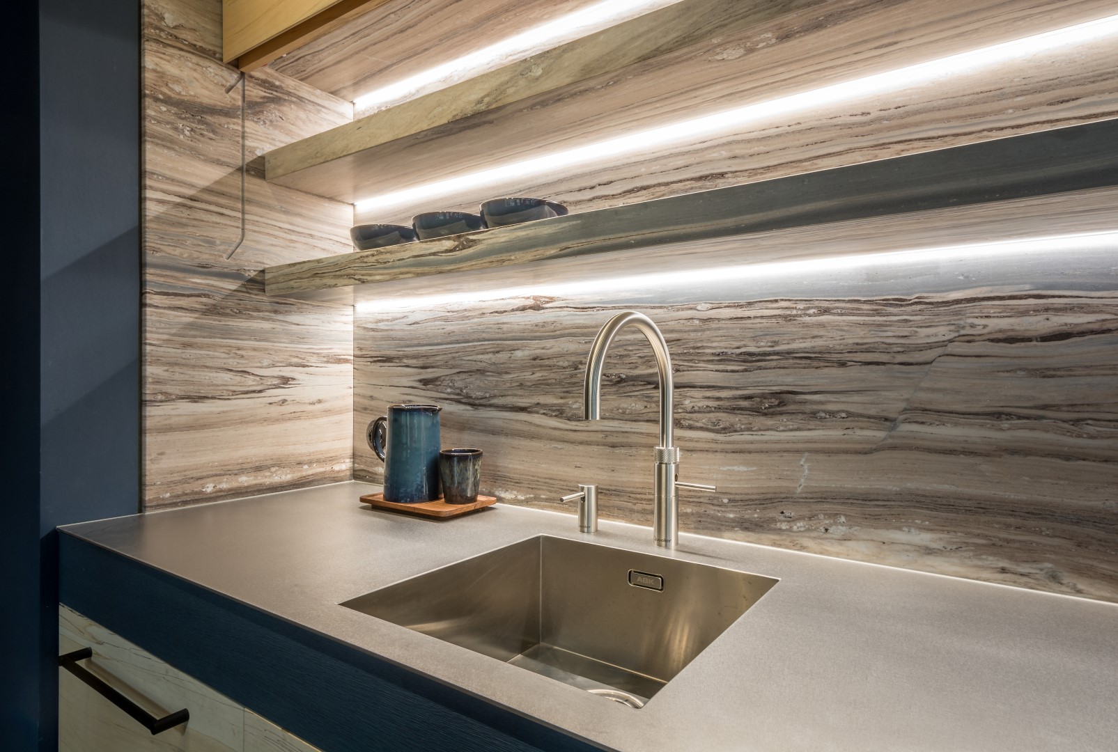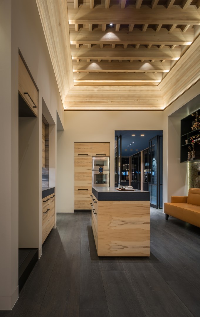 Eine Küche für diejenigen, die sich sowohl in der Verwendung von Materialien als auch in der Ausstattung von anderen abheben möchten. Die Basis dieser maßgeschneiderten Küche ist hochwertige Trüffelbuche, eine besondere Buchenholzart mit einzigartiger Struktur. Diese Textur entsteht durch spontan verursachten Pilzbefall und macht jedes Stück zu 100 % einzigartig. Die Arbeitsplatte aus poliertem Edelstahl passt wunderbar zum Pallissandro-Marmor an der Rückwand. Die dunkle Kontrastkante unter der Tischplatte besteht aus blau gebeizter Eiche und sorgt so für einen kräftigen Materialmix.