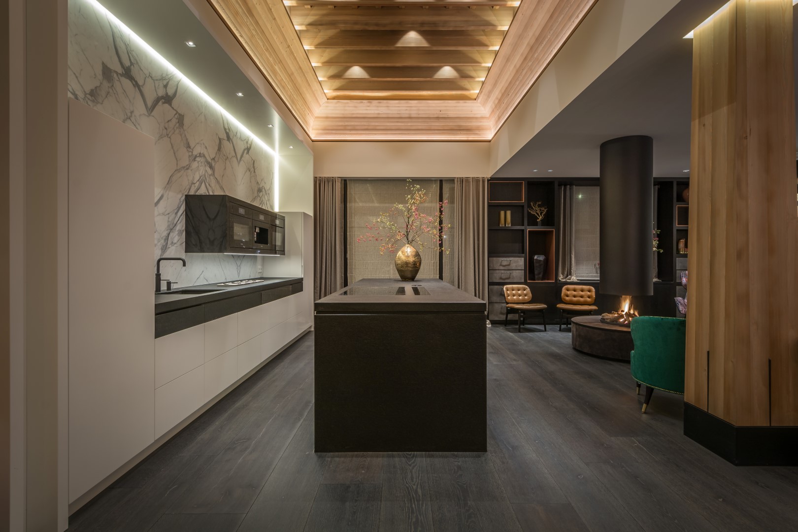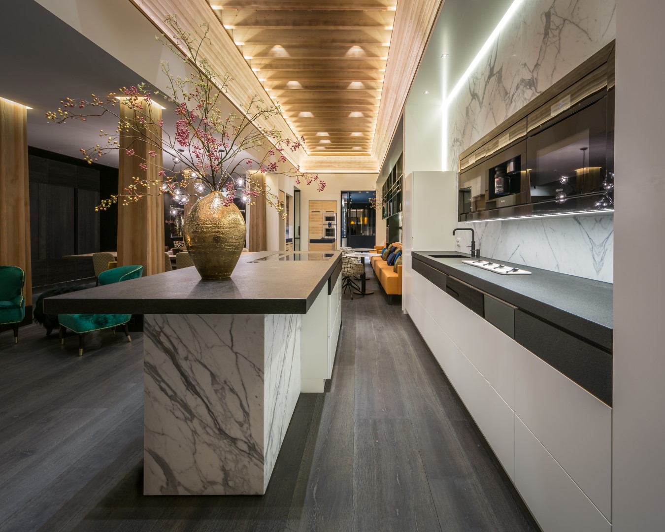 Diese besondere, maßgefertigte Küche ist eine perfekte Umsetzung zeitloser Klasse. Es ist eine Mischung aus Handwerkskunst und raffiniertem Design. Die Küche wurde mit einer Kombination aus zwei Arten von Natursteinen gestaltet, was zu einem einzigartigen und eleganten Ergebnis führt. Die gebrannte Granitplatte und der Marmorkörper und die Rückwand bilden eine schöne Synergie. Der in einem offenen Buchmuster ausgeführte Marmor erzeugt eine Symmetrie, die sofort die Aufmerksamkeit auf sich zieht. Diese Küche fungiert als eigenständiger Blickfang und fügt sich gleichzeitig nahtlos in das gesamte Interieur ein.
