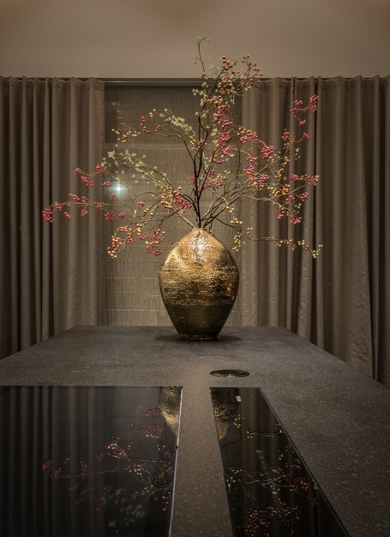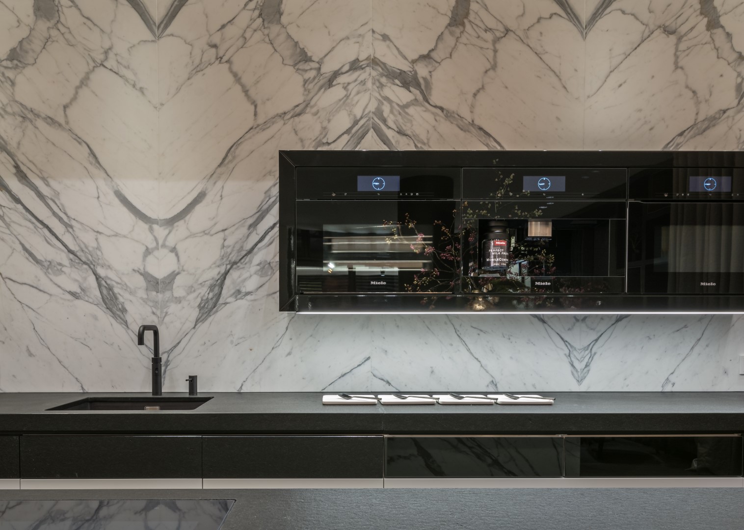Marmor ist für sein frisches, luxuriöses Aussehen und seinen zeitlosen Charakter bekannt, was diese Küche nicht nur zu einer wertvollen Ergänzung, sondern auch zu einer nachhaltigen Investition für die kommenden Jahre macht. Das schlagende Herz eines Haushalts ist oft die Küche und verdient daher besondere Aufmerksamkeit und Schönheit. Das dezente Cremeweiß der Schränke harmoniert mit dem Naturstein und bringt dieses Material optimal zur Geltung. Mit hochwertiger Miele-Ausstattung wie Induktionskochfeld, Arbeitsplattenabzug, Wärmeschublade und Geschirrwärmer ist diese maßgeschneiderte Küche nicht nur ein Augenschmaus, sondern auch der perfekte Arbeitsplatz für den leidenschaftlichen Koch.
