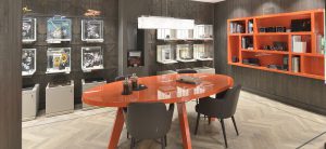 „Diskretion ist gerade im gehobenen Bereich äußerst wichtig. Van Hell legt großen Wert darauf, in dem Geschäft mit seinen Kunden in einer ganz persönlichen Atmosphäre kommunizieren zu können“, so Nico Schreuder. Flexibilität ist ein weiteres wichtiges Anliegen von Van Hell: „Die Markenvitrinen etwa sind modular in das Konzept integriert und können ausgetauscht werden, ohne dass der Laden komplett umgebaut werden muss“, berichtet Schreuder weiter. Auch die Deckenbespannung aus Stoff – momentan präsentiert sich hier die neu dazugekommene Marke Breitling mit Starfightern – kann problemlos ausgewechselt werden.