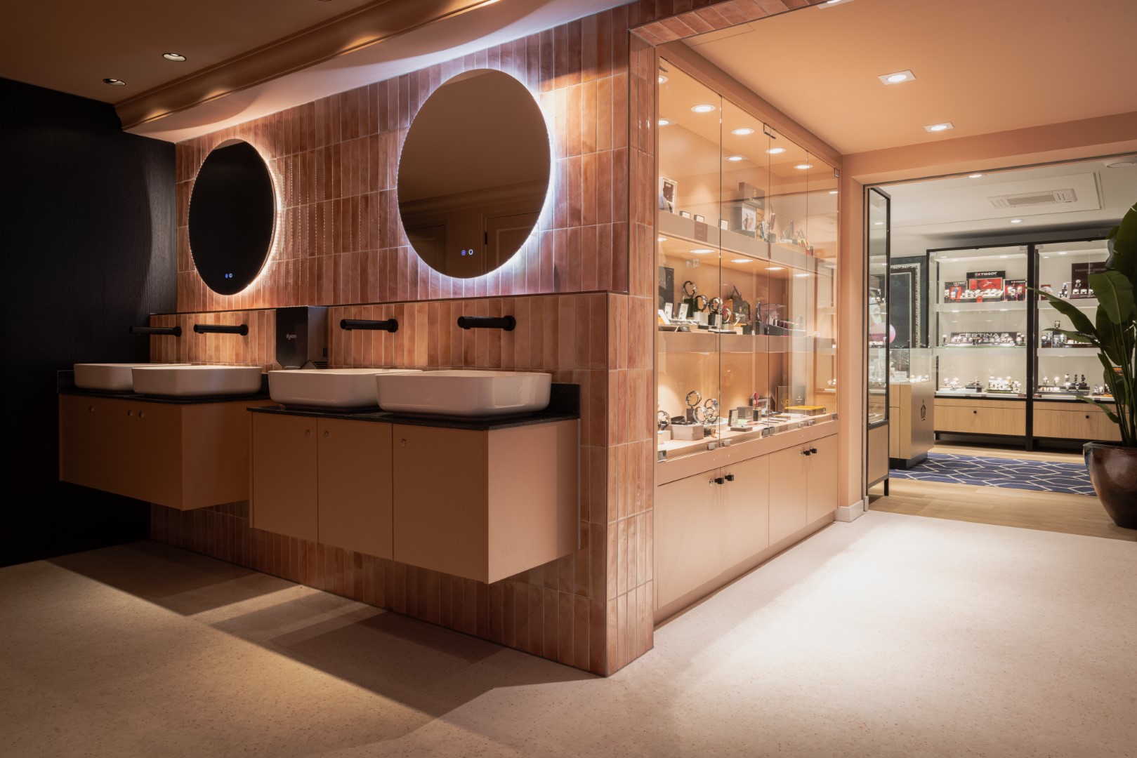 La boutique cadeaux s’étend naturellement vers une zone de toilettes, librement accessible aux clients. La transition visuelle entre le magasin et cet espace fonctionnel est subtile, créant une ambiance naturelle malgré deux fonctions distinctes. La conception intérieure sur mesure assure un aspect raffiné et cohérent, offrant au client une expérience unique – des espaces de vente aux espaces fonctionnels.